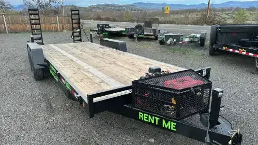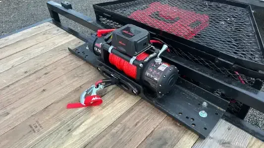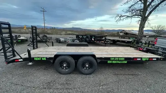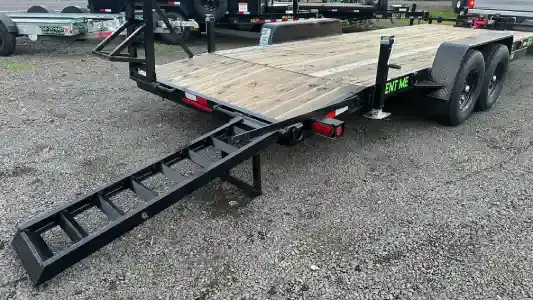 Heavy-duty flatbed trailer with a winch and 5' fold-down ramps for loading full-size trucks, vehicles, and cargo. Ideal for moving supplies, furniture, and other large items. The tandem-axle design provides a smooth ride and handles heavy loads with ease. Perfect for your next project or weekend getaway!